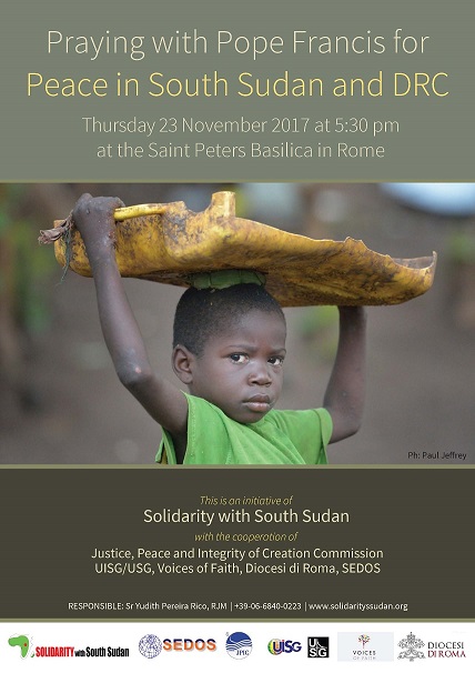 Fort émue de l’instabilité et des guerres qui sévissent dans ces deux Etats, l’Association « Solidarity with South Sudan and JPIC » organise ce jeudi 23 novembre à Rome, une journée de prière pour la paix au Sud-Soudan et en RDC. L’organisation a intéressé le pape François à y prendre part. C’est ainsi que préoccupé autant de la vie des populations de ce deux pays en crise, l’évêque de Rome a répondu favorablement à la demande lui est adressée par l’organisation. Le pape les rassure de sa présence pour la prière afin que règne la paix et la justice dans ces Etats.